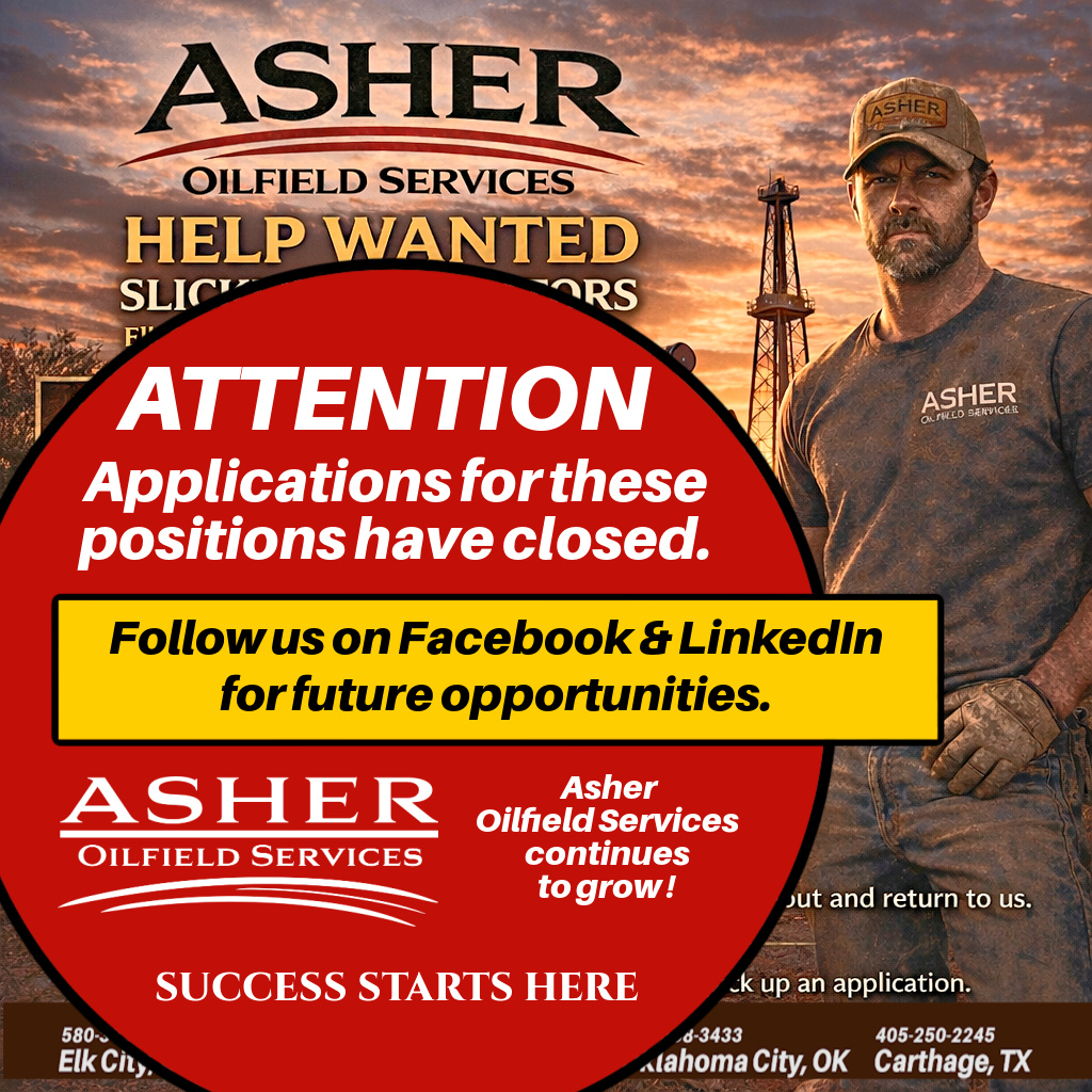 Follow us on Facebook and LinkedIn for postings about career opportunities at Asher Oilfield Services. Feel free to stop by our locations in Lindsay, Elk City & Weatherford and fill out an application, we are always happy to keep your information for our next potential job opening.