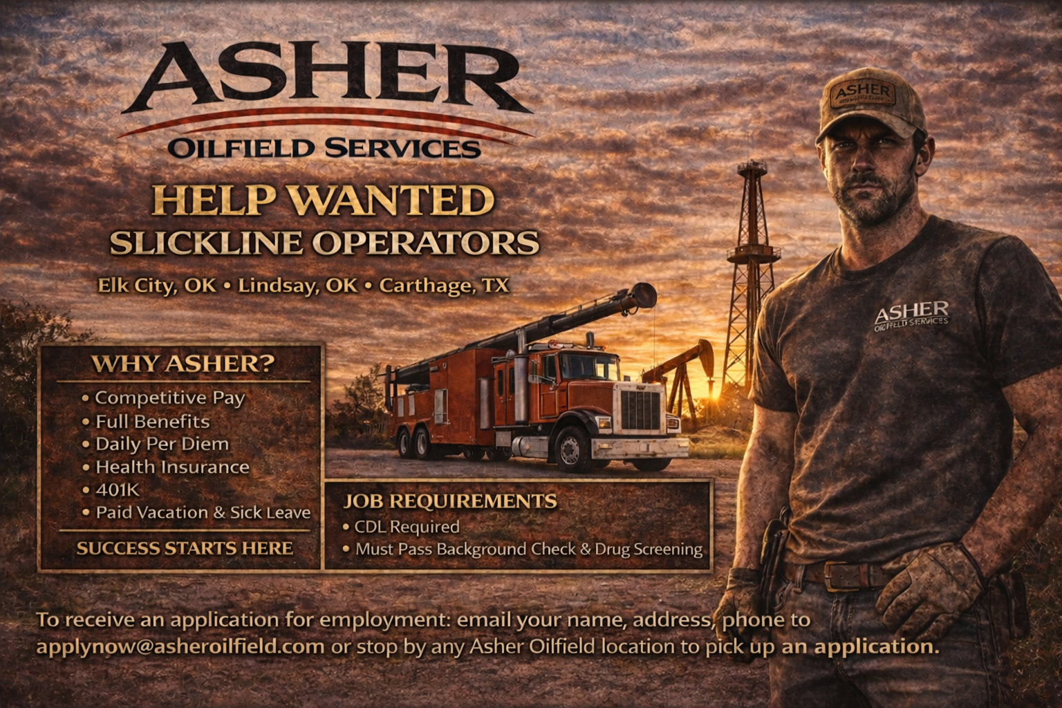 To receive an application for slickline employment: email your name, address, phone to applynow@asheroilfield.com or stop by any Asher Oilfield Services location to pick up an application. We appreciate your interest and look forward to hearing from you.