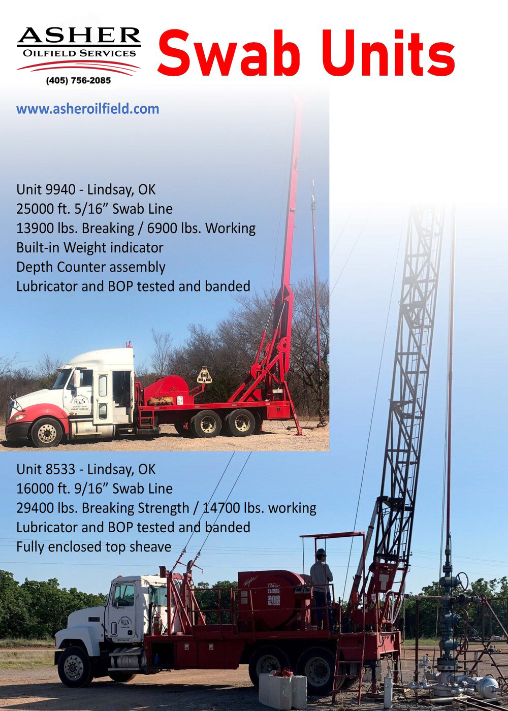 With eight fully equipped swab units and experienced crews, Asher Oilfield Services delivers dependable swabbing services wherever your rigs are located. From well cleanouts to pressure recovery, we help restore flow quickly, safely, and efficiently.